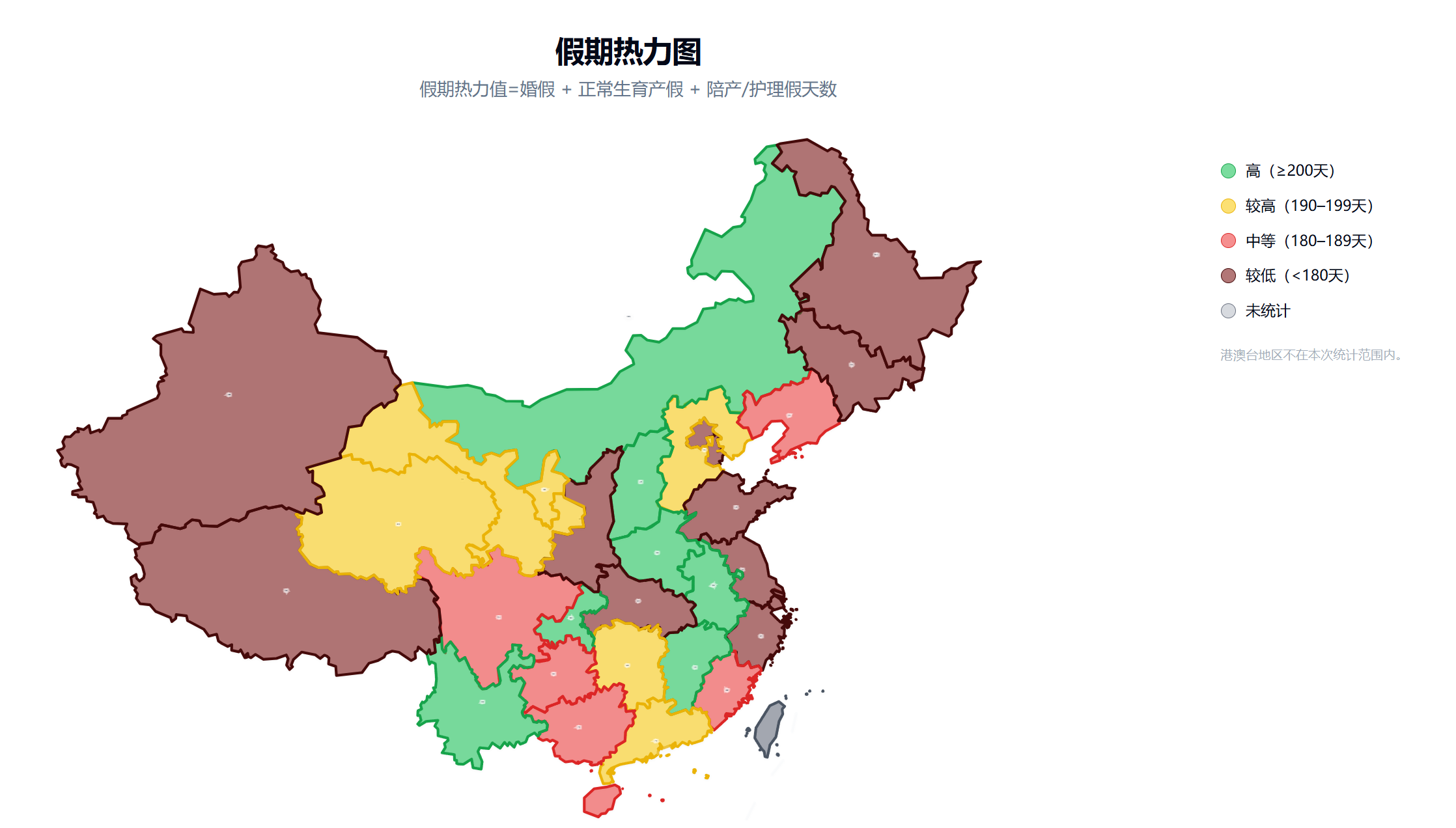 地图的热力图配色也调了很久。我定义了一个"假期热度值",把婚假天数、产假天数和陪产假天数相加,然后分成四档: